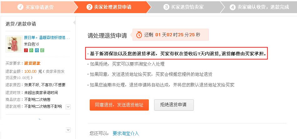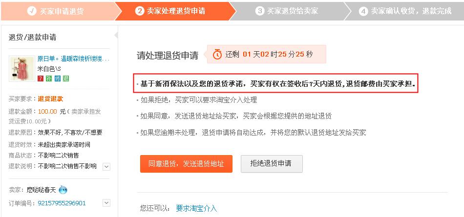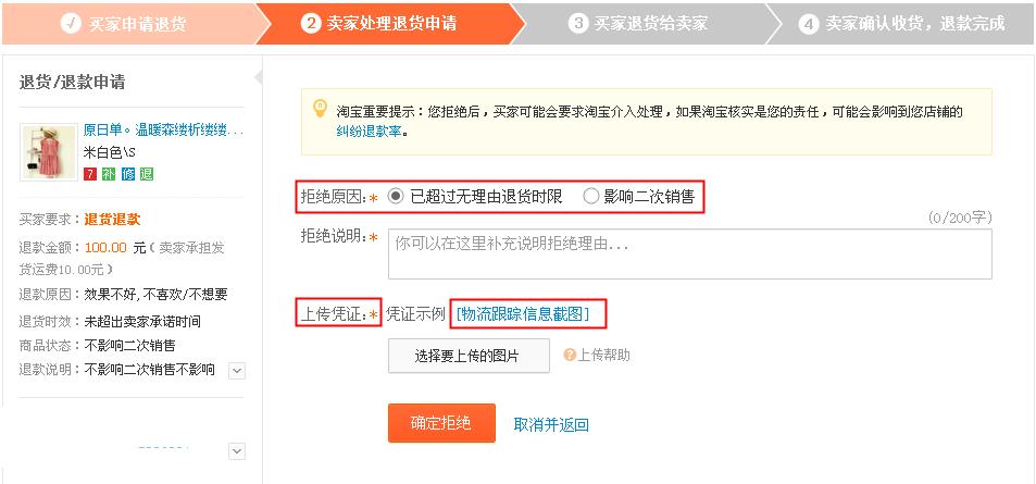 (注意:1、卖家拒绝必须选择原因,且只允许这两种原因才能拒绝,如果卖家有退货承诺且允许影响二次销售,则拒绝原因中影响二次销售的选项不出现。2、老的7天无理由退货是不允许拒绝的,本次允许拒绝,但需上传凭证(必选),证实拒绝是合理的。)